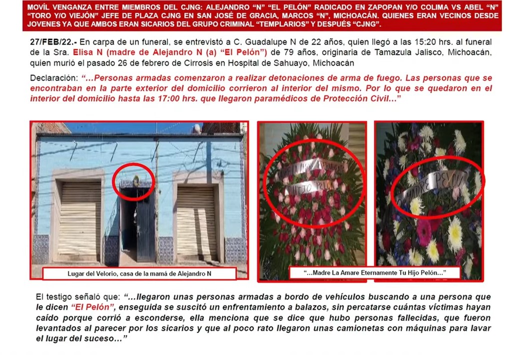“Alejandro ‘N’, llegó al funeral con aproximadamente 15 sicarios o gente que lo resguardaba. A los pocos minutos llegan varias camionetas con sicarios, al frente Abel ‘N’ y someten a los acompañantes de Alejandro alias ‘El Pelón’, los desarman y los colocan como aparecen en algunos videos, afuera de una casa, en un portón”, relató el funcionario.