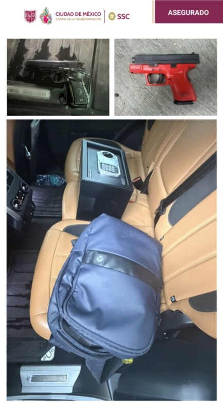 En la revisión del vehículo presuntamente utilizado por los sospechosos, las autoridades localizaron dos armas de fuego cortas, una mochila con diversas herramientas y una caja fuerte Fotos: SSc_CDMX