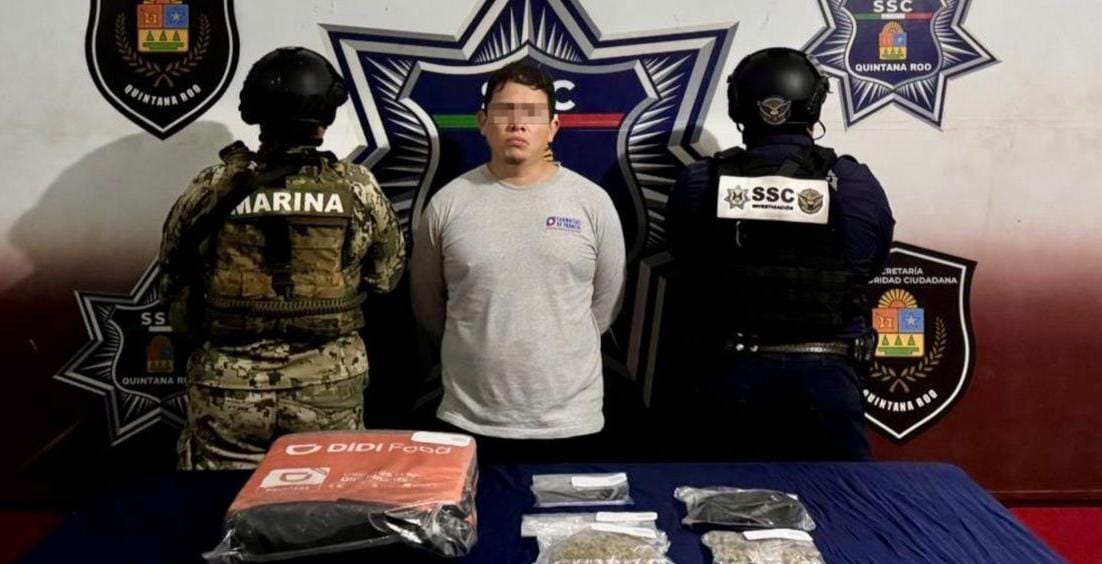 En una segunda intervención, durante recorridos de vigilancia en la Supermanzana 259, fraccionamiento Las Palmas, los elementos detectaron a un hombre que manipulaba bolsitas con vegetal verde similar a la marihuana.