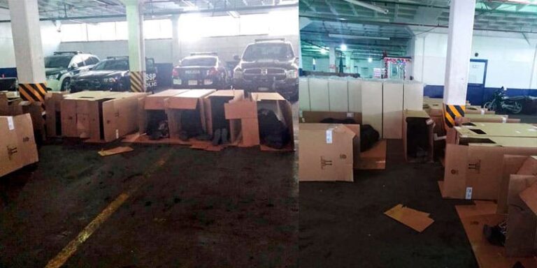 En las fotografías se pueden ver a los agentes acostados sobre pedazos de cartón y otros dentro de las cajas en un estacionamiento.