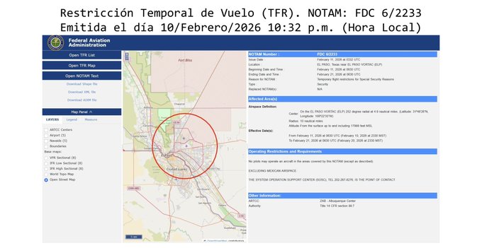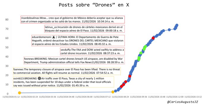 Explicó que los primeros mensajes en redes sociales no precisaban el origen del cierre del espacio aéreo. Sin embargo, a las 8:28 horas, Fox News informó que drones vinculados a cárteles mexicanos habrían provocado la restricción.