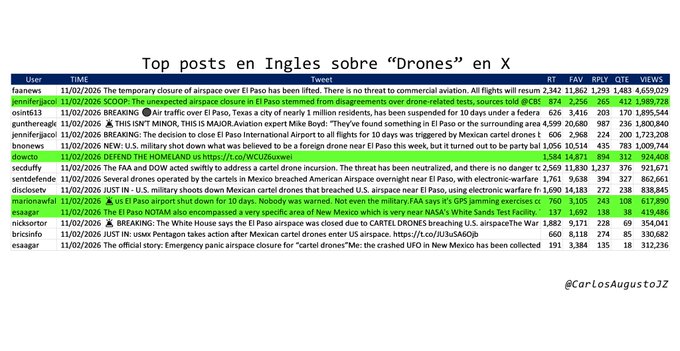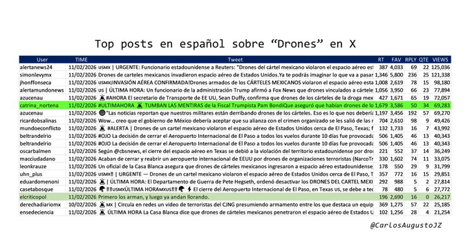 En México, en cambio, la conversación tomó un giro marcadamente político. Entre las publicaciones con mayor alcance destacaron cuentas críticas del gobierno encabezado por la presidenta Claudia Sheinbaum Pardo, que amplificaron interpretaciones como “invasión aérea”, “drones armados del narco”, “alianza gobierno-crimen” y hasta la justificación de una posible acción militar en territorio mexicano.