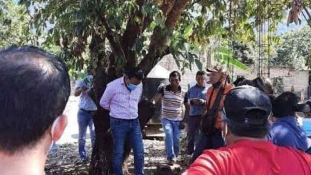 Según la versión, es que el alcalde Óscar Ramírez fue detenido durante un recorrido entregando techos firmes y después fue llevado al lugar para que respondiera por la obra de mala calidad, donde fue atado de manos a un árbol y los ciudadanos le reclamaron por esto.