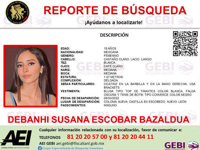 Días antes, el pasado 7 de abril, según informa la Fiscalía estatal, otra joven desaparecida, María Fernanda Contreras Ruiz, fue localizada muerta en una vivienda del municipio de Apodaca, también conurbado de la capital de Nuevo León.