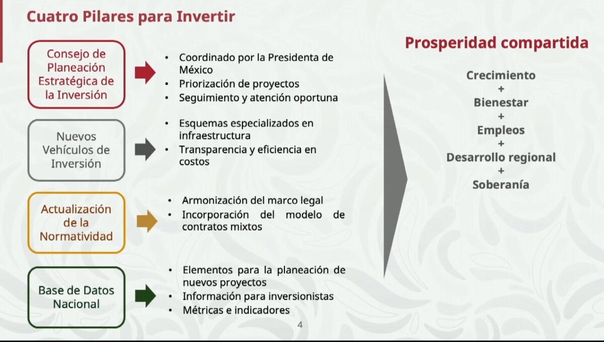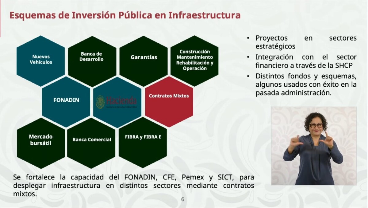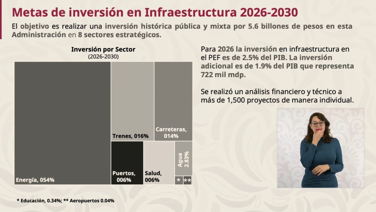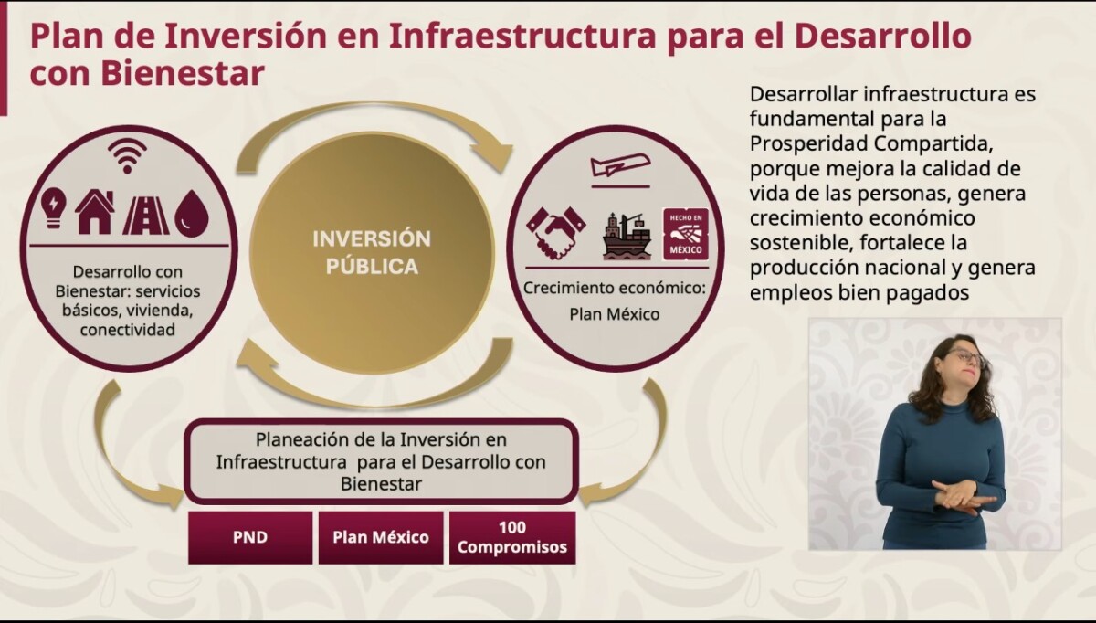 Con el objetivo de fortalecer el Plan México, la Secretaría de Hacienda presentó el Plan de Inversiones en Infraestructura para el Desarrollo. La presidenta Claudia Sheinbaum sostuvo que a través de una mayor integración de inversiones públicas con inversiones privadas se pretende que la inversión en 2026 sea de 722 mil millones de pesos adicionales a los 900 mil millones de pesos previstos ya en el presupuesto de egresos.