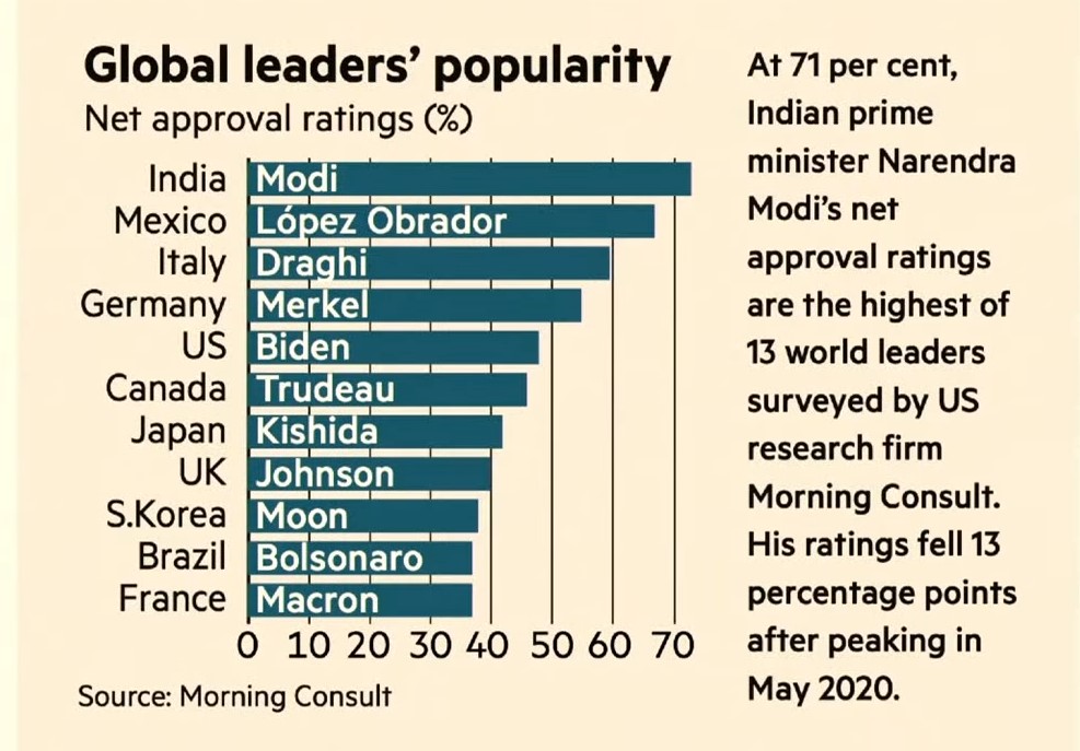 Con base en una encuesta de Morning Consult, una empresa basada en Estados Unidos, el mandatario goza de un 65 por ciento de aprobación, lo que le coloca detrás del presidente de la India Narendra Modi, cuya tasa de popularidad alcanzaría 71 por ciento.
