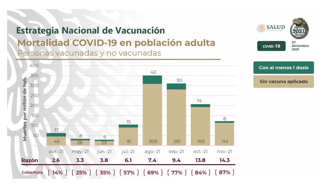 Mostró gráficas en la que se muestra el efecto de la aplicación del antígeno y dijo que “es claramente evidente” que las personas no vacunadas representan la mayor cantidad de fallecimientos por el coronavirus. De igual forma, en el sector de personas mayores de 60 años, las muertes de quienes tenían una o dos dosis representa diez veces menos que los que no se vacunaron.