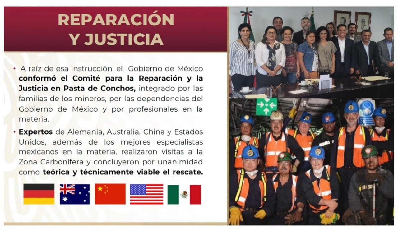 Bartlett destacó que esta mina pertenecía a Grupo México, uno de los consorcios más poderosos del país, que durante el gobierno de Vicente Fox, cuando ocurrió la tragedia, declinó continuar el rescate porque consideró que ese esfuerzo humanitario era muy peligroso y costoso. Destacó que el compromiso de este gobierno es lograr la recuperación de los cuerpos antes de concluir el sexenio.