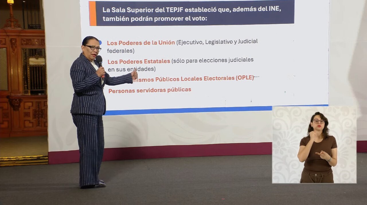 La titular de la Secretaría de Gobernación, Rosa Icela Rodríguez, informó sobre los cambios en la promoción del voto y veda electoral que el Tribunal Electoral resolvió para el proceso electoral del Poder Judicial que se llevará a cabo el próximo 1 de junio, al determinar que el Instituto Nacional Electoral (INE) no es la única autoridad que puede realizar estas actividades.