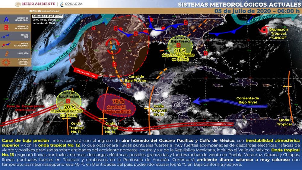 Por otra parte, la onda tropical No. 13 recorrerá el sureste de México, originará lluvias puntuales intensas, descargas eléctricas, posibles granizadas y fuertes rachas de viento en Puebla, Veracruz, Oaxaca y Chiapas, lluvias puntuales fuertes en Tabasco y chubascos en la Península de Yucatán.