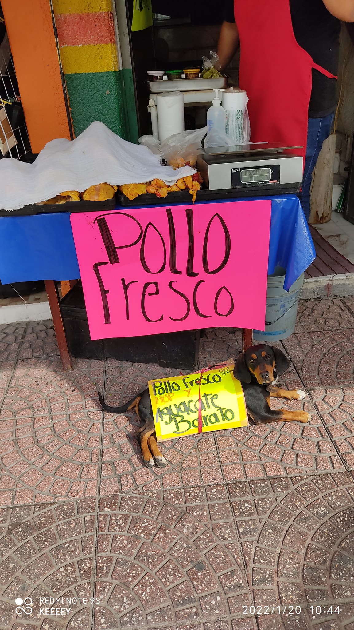 El simpático perro se llama «Eliot Veneno», y vive en Tula de Allende, donde se ha hecho muy popular entre la población local ya que de esta manera ayuda a su dueño en la venta de pollo y aguacate, productos que comercializa en este mercado.