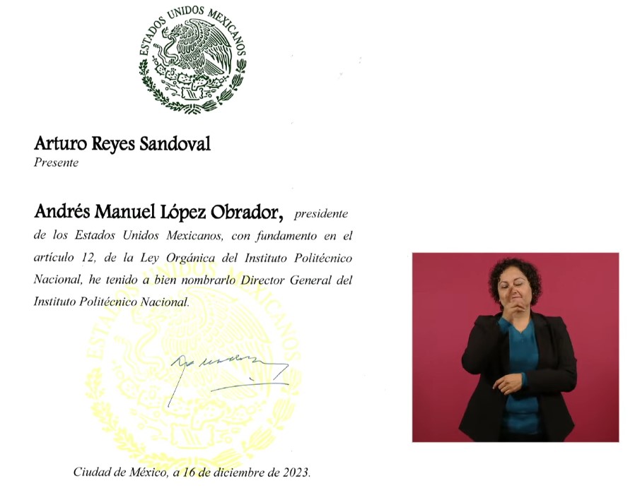 Este nombramiento se fundamenta en el artículo 12 de la Ley Orgánica del Instituto Politécnico Nacional, de acuerdo con un documento presentado por el mandatario en conferencia de prensa matutina.