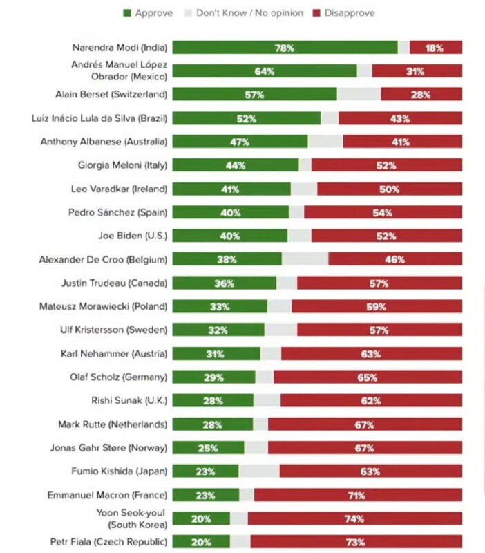 Después le sigue Lula da Silva de Brasil (52%), Anthony Albanese de Australia (47%), Giorgia Meloni de Italia (44%), Pedro Sánchez de España (40%), Joe Biden (40%), Alexander de Croo de Bélgica (38%), Justin Trudeau de Canadá (36%), Mateusz Morewiecki de Polonia (33%), Ulf Kristersson de Suecia (32%), Olaf Scholz de Alemania (29%), Rishi Sunat del Reino Unido (28%), Mark Rutte de Países Bajos (28%), Jonas Gahr Store de Noruega (25%), Fumio Kishida de Japón (23%), Emmanuel Macron de Francia (23%), Yoo Seok-Youl de Corea del Sur (20%), y Petr Fiala de la República Checa (20%).