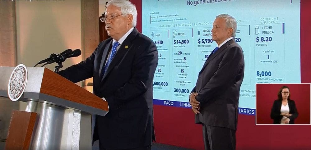 El Programa Precios de Garantía favorecerá gradualmente la autosuficiencia de maíz, frijol, trigo panificable y arroz, así como de la leche fluida. “Esto se logra al garantizar precios competitivos a todos los pequeños y medianos productores… Sin intermediarios y sin coyotes”, dijo Villalobos.