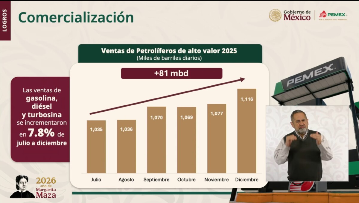 Afirmó que, durante 2025, la comercialización de petrolíferos de alto valor aumentó de manera sostenida, con un incremento de 7.8%, lo que equivale a 81 mil barriles diarios.