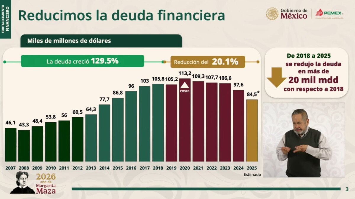 La deuda de Petróleos Mexicanos (Pemex) se redujo en 20 mil millones de dólares en 2025 frente a 2018, con lo que al cierre del año pasado se ubicó en 84.5 mil millones de dólares, lo que representa su nivel más bajo en los últimos 11 años, informó el director general de la empresa, Víctor Rodríguez Padilla.