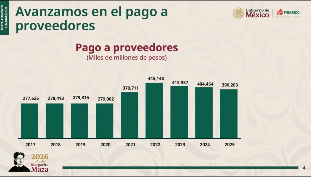 Asimismo, destacó el avance en el pago a proveedores, que superó los 390 mil millones de pesos, a través de un programa de financiamiento de inversión implementado en septiembre de 2025 en coordinación con Banobras y la Secretaría de Hacienda, lo que permitió normalizar la operación y fortalecer las cadenas productivas.