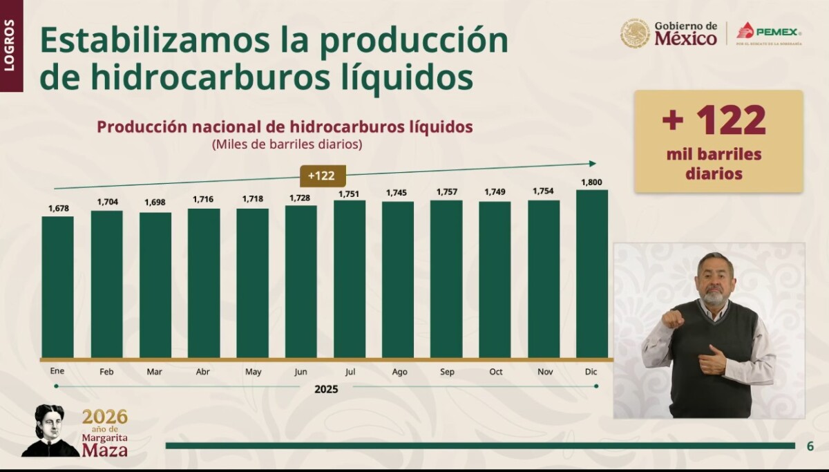 Finalmente, anunció que en 2026 continuará la modernización del sistema de refinación, con la conclusión de los trabajos en la refinería de Tula y avances en Salina Cruz, con la meta de alcanzar un procesamiento de 1.56 millones de barriles diarios. Asimismo, se fortalecerá la petroquímica con proyectos estratégicos en etano-etileno y aromáticos, y se avanzará en nuevas iniciativas vinculadas a energías alternativas como parte de la transición hacia un sistema energético de menor huella de carbono.