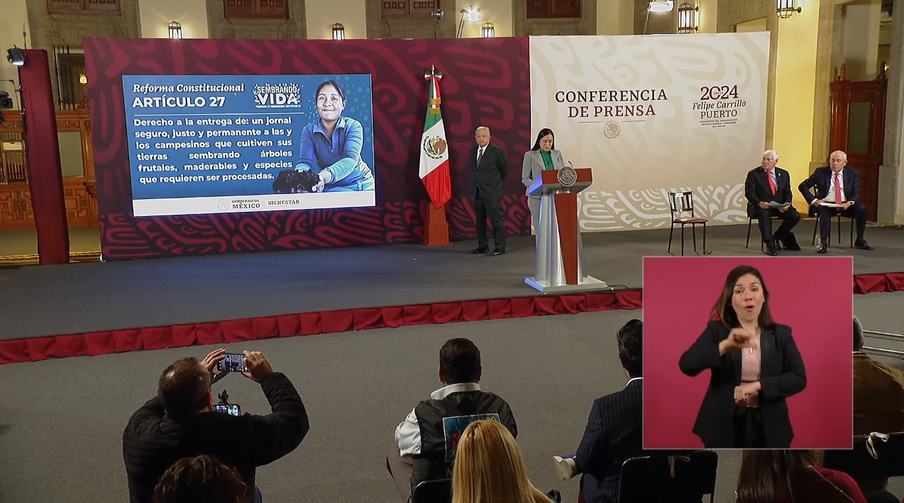 La propuesta de reforma constitucional aplica al Artículo 27 propone: “Derechos. la entrega de: un jornal seguro, justo y permanente a las y los campesinos que cultiven sus tierras sembrando árboles frutales, maderables y especies que requieren ser procesadas”.