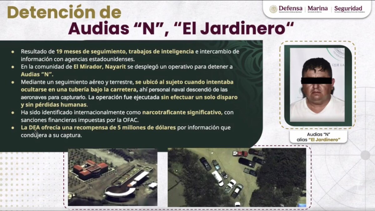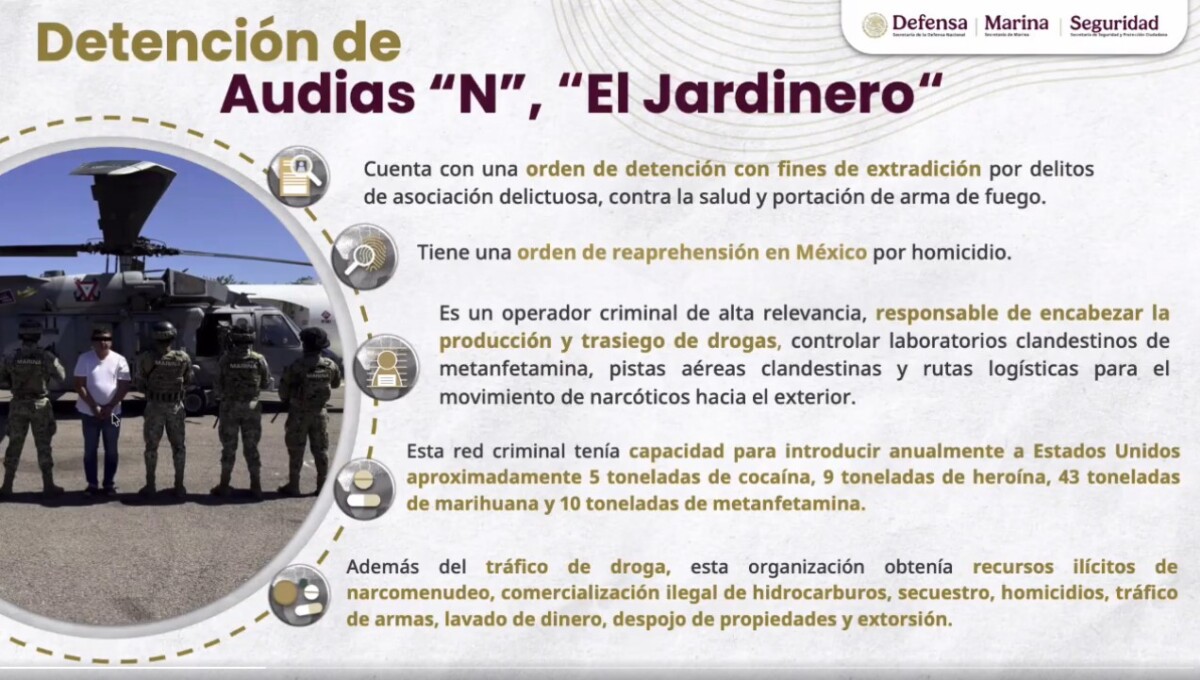 El Jardinero, dijo García Harfuch, es «un operador criminal de alta relevancia, que durante más de dos décadas consolidó una estructura regional con capacidad para coordinar la producción y trasiego de drogas, supervisar laboratorios clandestinos de metanfetamina, operar aeronaves y pistas de aterrizaje, así como controlar rutas logísticas para el movimiento de narcóticos hacia el exterior».