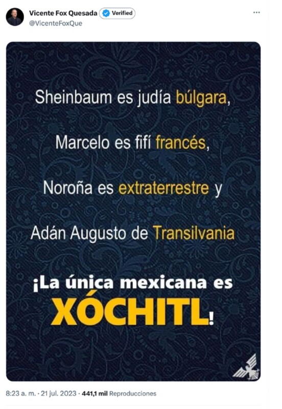 “Sheinbaum es judía búlgara, Marcelo es fifí francés, Noroña es extraterrestre y Adán Augusto de Transilvania”, se lee en la imagen que compartió en aquel momento y que después borró.