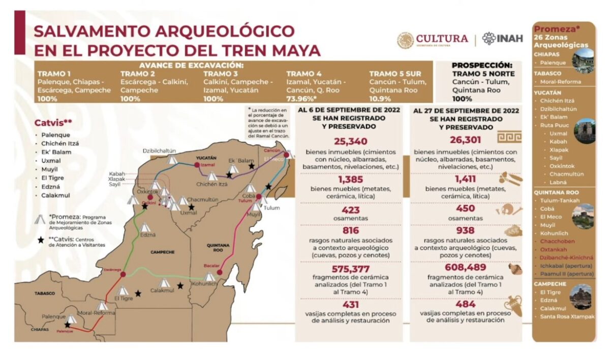 El titular del INAH, Diego Prieto indicó que se avanza en la investigación y protección del patrimonio que se ha identificado a lo largo de toda la ruta. Explicó que en los tramos 1 a 3 se ha concluido las obras de excavación por lo que en esos tramos ocupamos de terminar salvamento en estaciones, paraderos y cocheras. En el tramo 4, hubo un ajuste en el ramal de arribo a Cancún y hay un 75 por ciento de excavación.