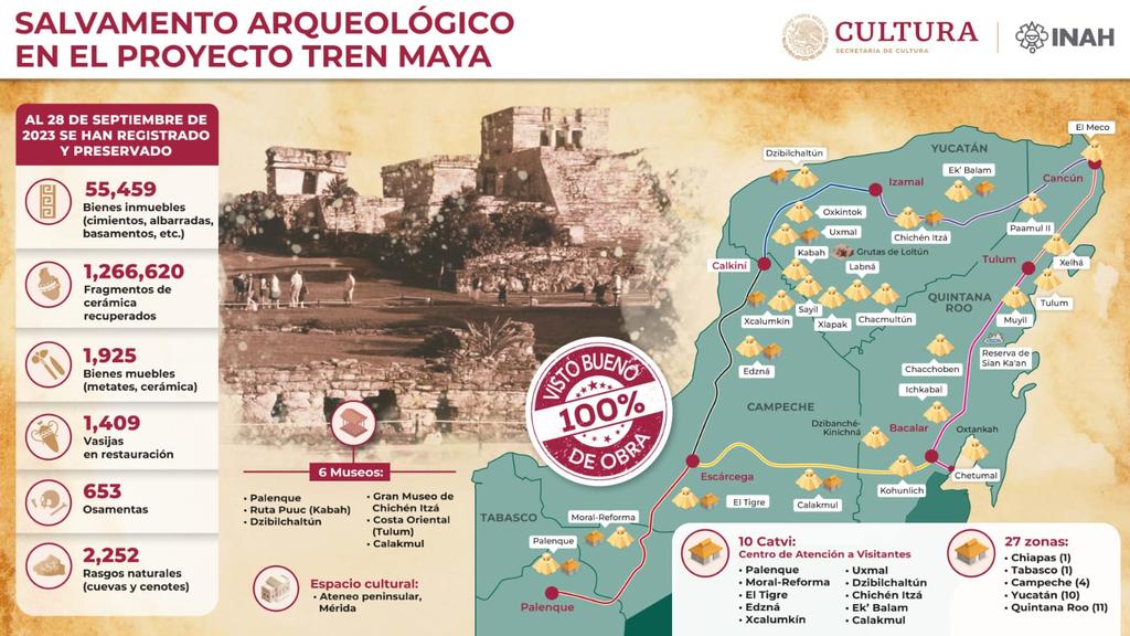 Al encabezar el informe de rescate arqueológico por el Tren Maya, el presidente Andrés Manuel López Obrador indicó que la rehabilitación y conservación de zonas arqueológicas en el sureste contribuye a reforzar la identidad del pueblo de México.