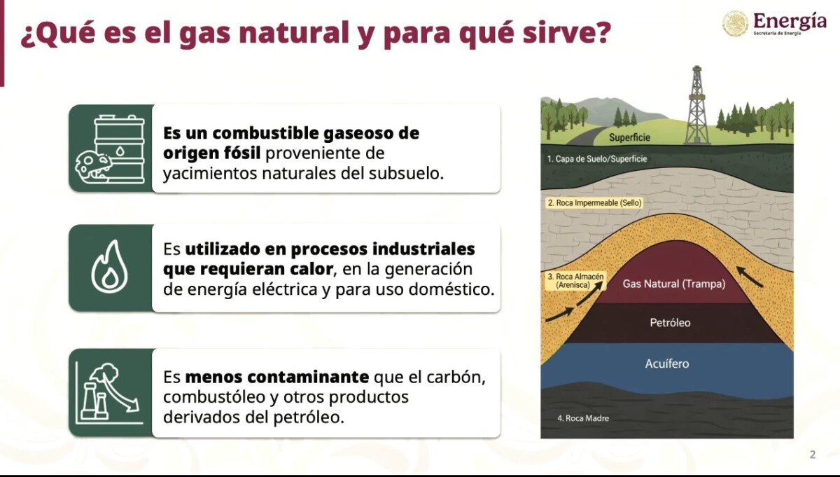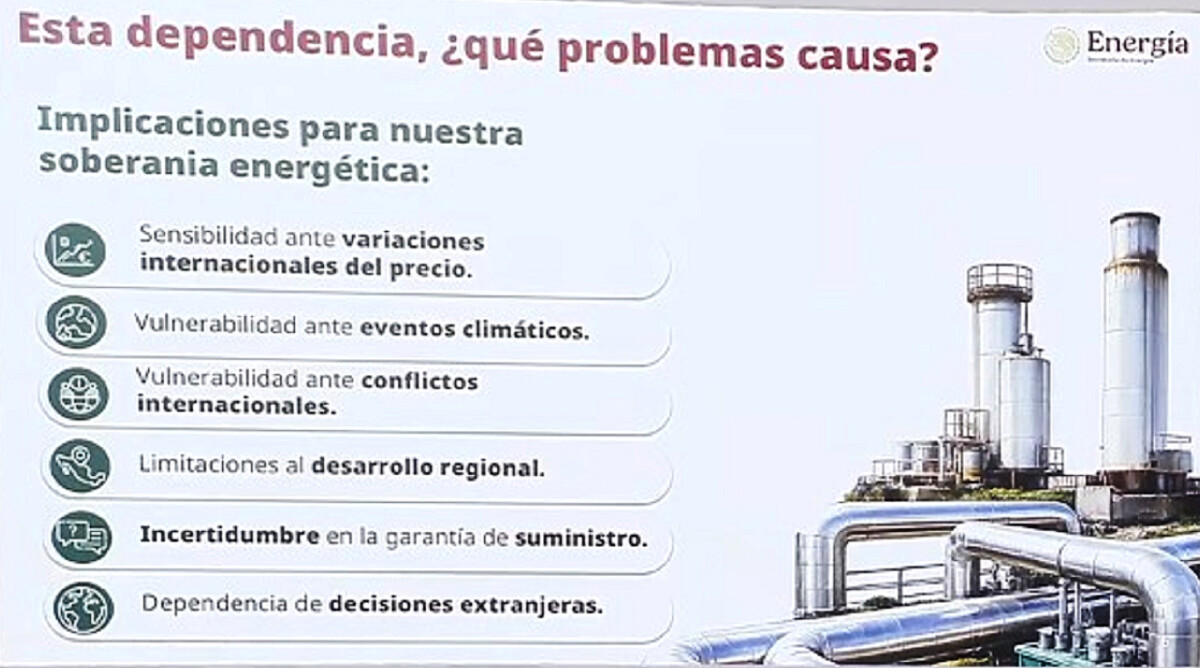 Luz Elena González, secretaria de Energía, señaló que cerca del 74% del gas natural que se consume en nuestro país es importado principalmente de Estados Unidos, lo que representa riesgos en el suministro ante coyunturas externas o conflictos internacionales.