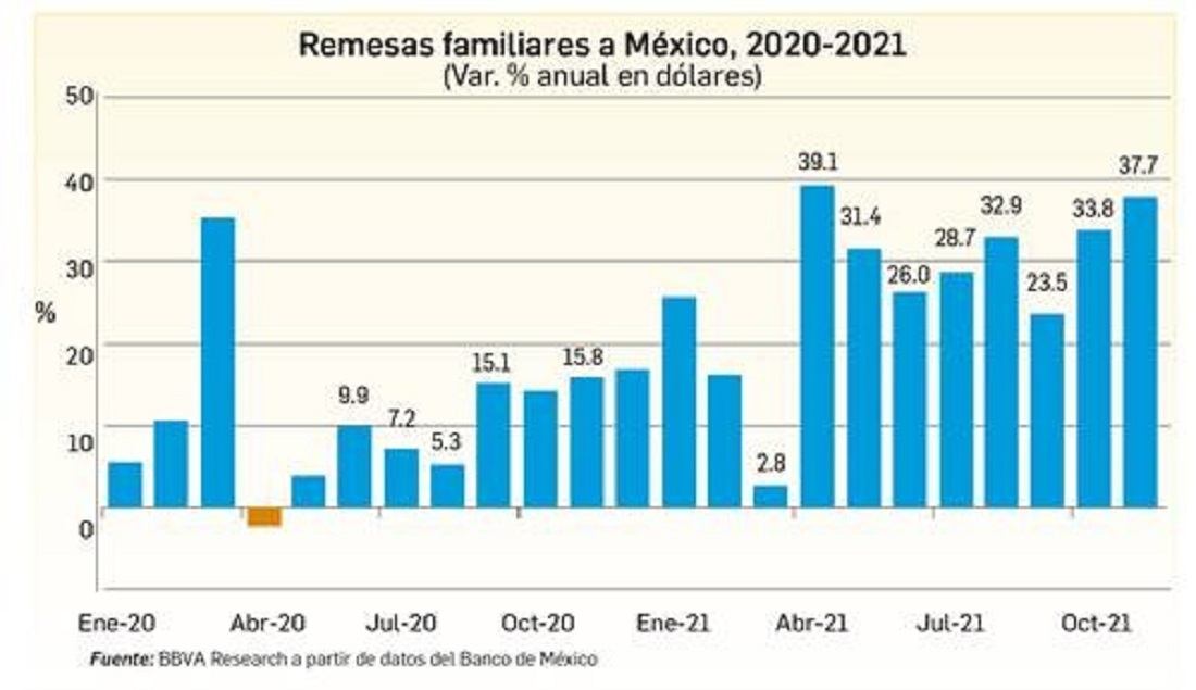 “Las remesas van a superar por sexto año consecutivo su máximo histórico con un monto cercano a los 51 mil 500 millones de dólares y un crecimiento superior a 25 por ciento para el cierre del año 2021”, detalló en un estudio BBVA.