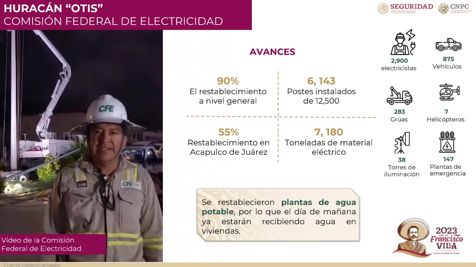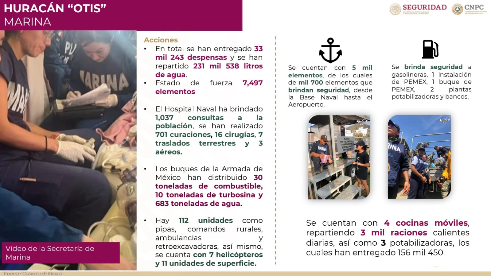 La coordinadora nacional de Protección Civil, Laura Velázquez Alzúa, puntualizó en un enlace en vivo los avances en la entrega de despensas, agua y comidas calientes por parte de las Fuerzas Armadas, así como del censo de afectaciones de la Secretaría de Bienestar.