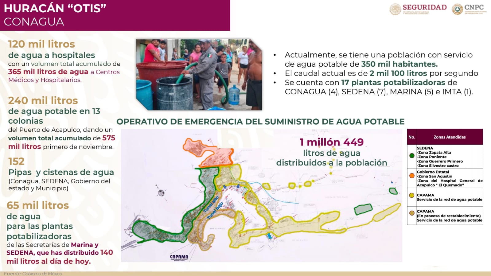 83 cisternas de agua instaladas en Acapulco, que han aportado 2 millones 804 litros distribuidos.