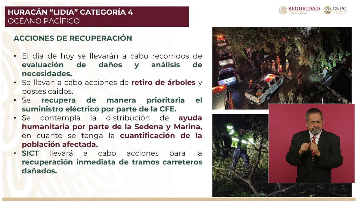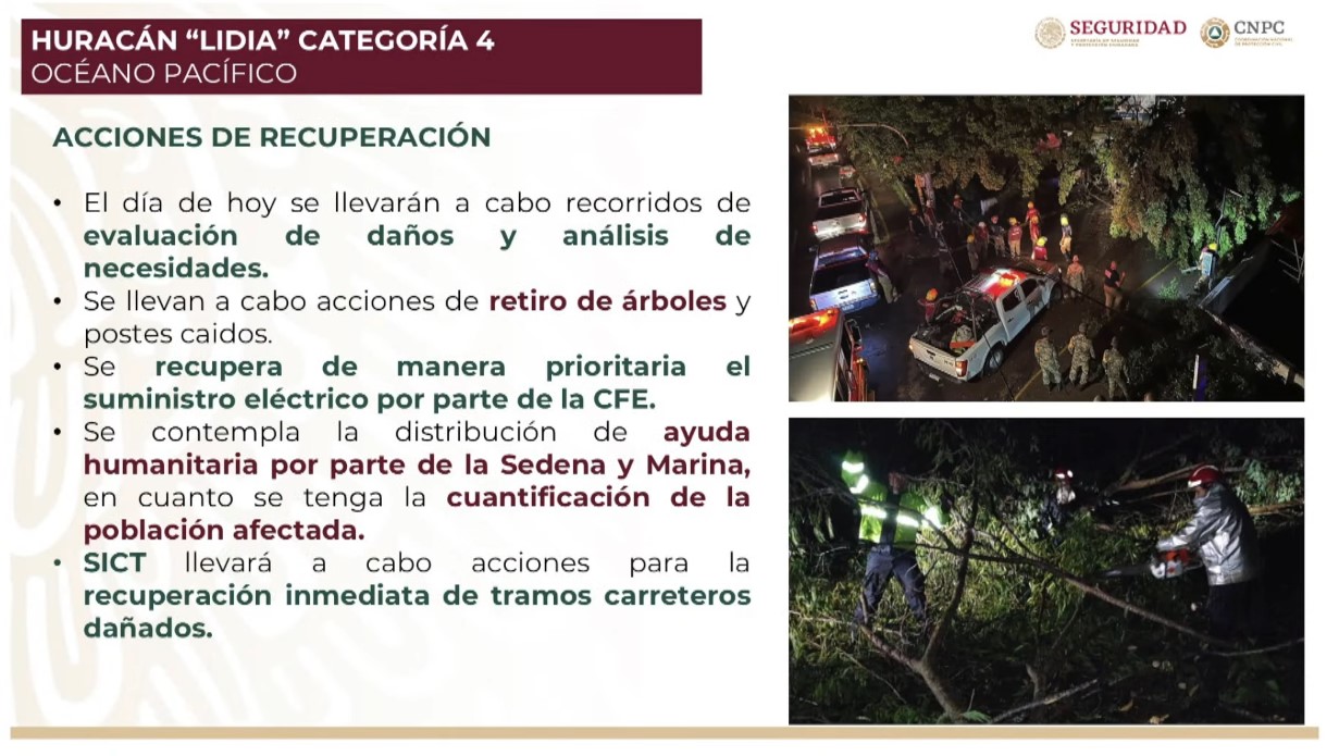 La Comisión Nacional del Agua (Conagua) informó que el huracán Lidia se debilitó a baja presión remanente al sur-sureste de Zacatecas. Se prevé que en las siguientes horas se mantengan lluvias muy fuertes en Nayarit, Jalisco, Colima y Zacatecas.