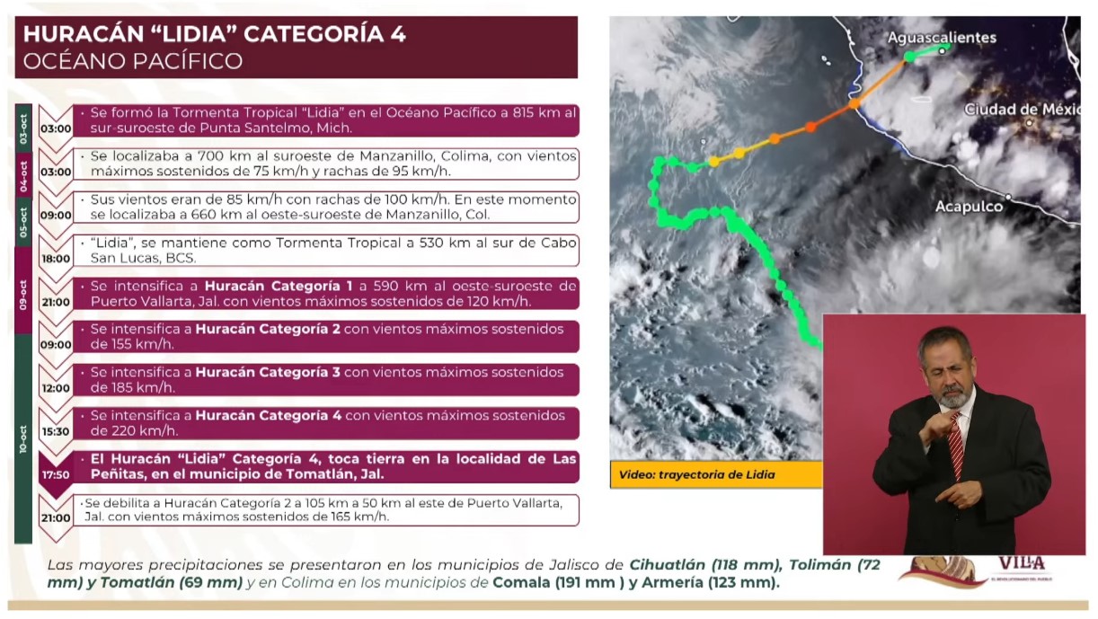 La Comisión Nacional del Agua (Conagua) informó que el huracán Lidia se debilitó a baja presión remanente al sur-sureste de Zacatecas. Se prevé que en las siguientes horas se mantengan lluvias muy fuertes en Nayarit, Jalisco, Colima y Zacatecas.