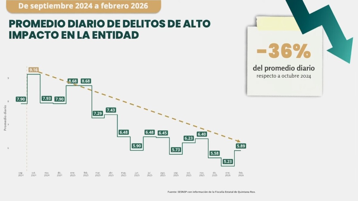 La funcionaria también informó que el estado registró una reducción del 68% en el promedio diario de homicidio doloso al comparar febrero de 2025 con febrero de 2026, posicionándose como el mes con menor incidencia en este delito desde 2016. Además, el promedio diario de delitos de alto impacto disminuyó 36%, al pasar de 9.16 en octubre de 2024 a 5.89 en febrero de 2026.
