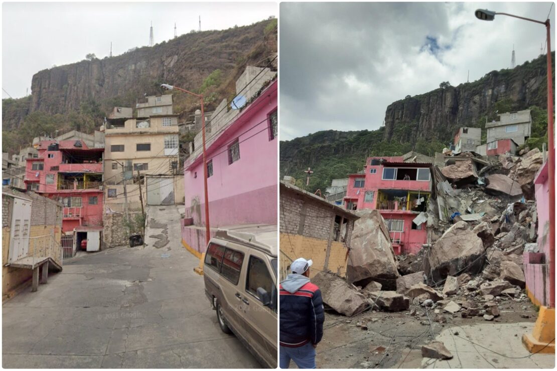 El desgajamiento de peñas en el Cerro del Chiquihuite aplastó casas, vehículos, postes y taponó la calle Club Exploradores de Chimalhuacán, en la colonia Lázaro Cárdenas, Tercera Sección, en la parte alta de la Sierra de Guadalupe.