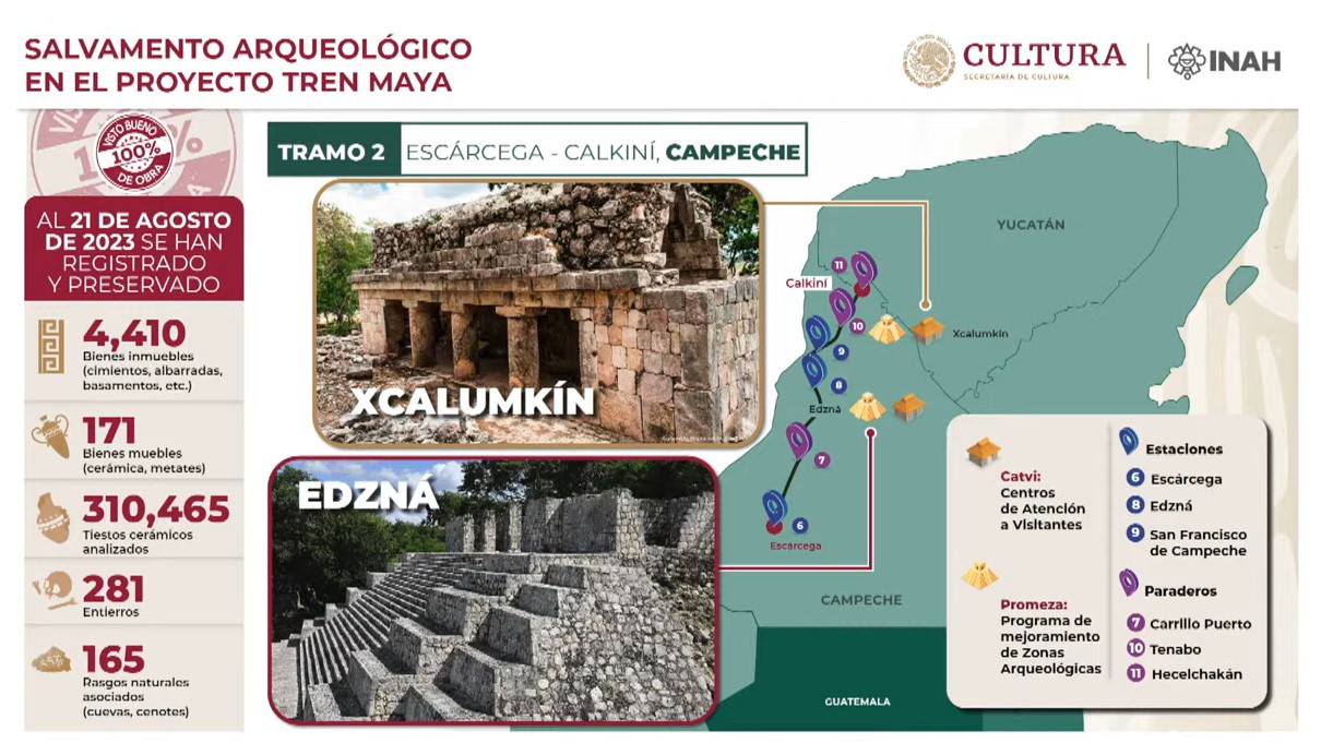 Dio a conocer que se han registrado y preservado al 21 de agosto: 4 mil 410 bienes inmuebles como cimientos, albarradas y basamentos; 171 bienes muebles, entre metates y cerámica; 310 mil 465 fragmentos de cerámica analizados, 281 osamentas y 165 rasgos naturales como cuevas y cenotes.