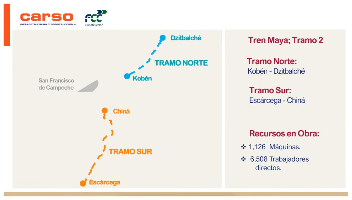 Sin embargo, el director general de Grupo Carso, Antonio Gómez, comentó que el tramo 2 comprende dos subtramos. Mencionó que el tramo norte está totalmente terminado, incluidas las obras de drenaje y pasos peatonales, vehiculares y de fauna, en tanto que en el sur, se tiene un avance del 98 por ciento.