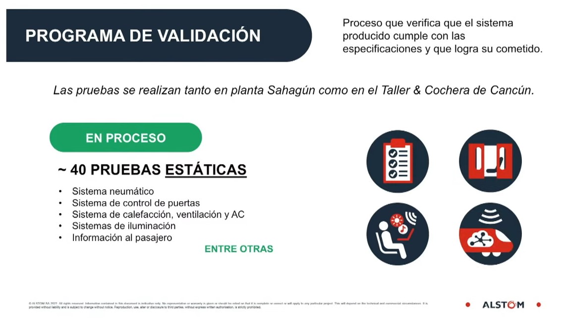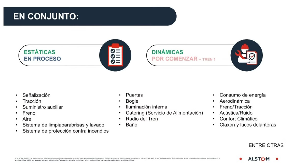 Por su parte, Maite Ramos, de Alstom, la empresa que construye los trenes, dijo que en la actualidad se han iniciado ya las pruebas estáticas y dinámicas del tren 2 a fin de que esté listo para el próximo primero de septiembre cuando se realizará el primer viaje de supervisión. En esta etapa se realizan paulatinamente el tren en movimiento, con diversas velocidades para corroborar su desempeño en pendientes o en curvas, destacando que el peso de los vagones está entre 44 y 50 toneladas.