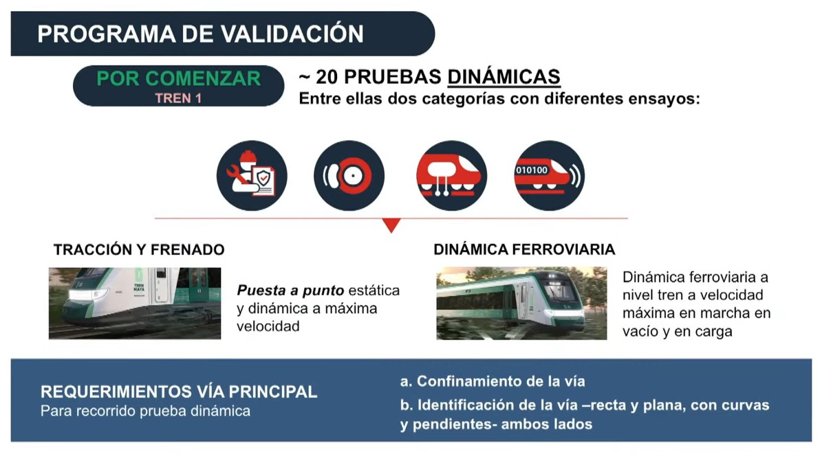 En conferencia matutina con el presidente Andrés Manuel López Obrador, refirió que está por iniciar 24 pruebas dinámicas el primer convoy del Tren Maya, que se encuentra en el taller y cochera de Cancún. Hará diferentes ensayos de frenado y velocidad en vacío y en carga, así como la identificación de la vía recta y curva, pendientes y condiciones climatológicas.