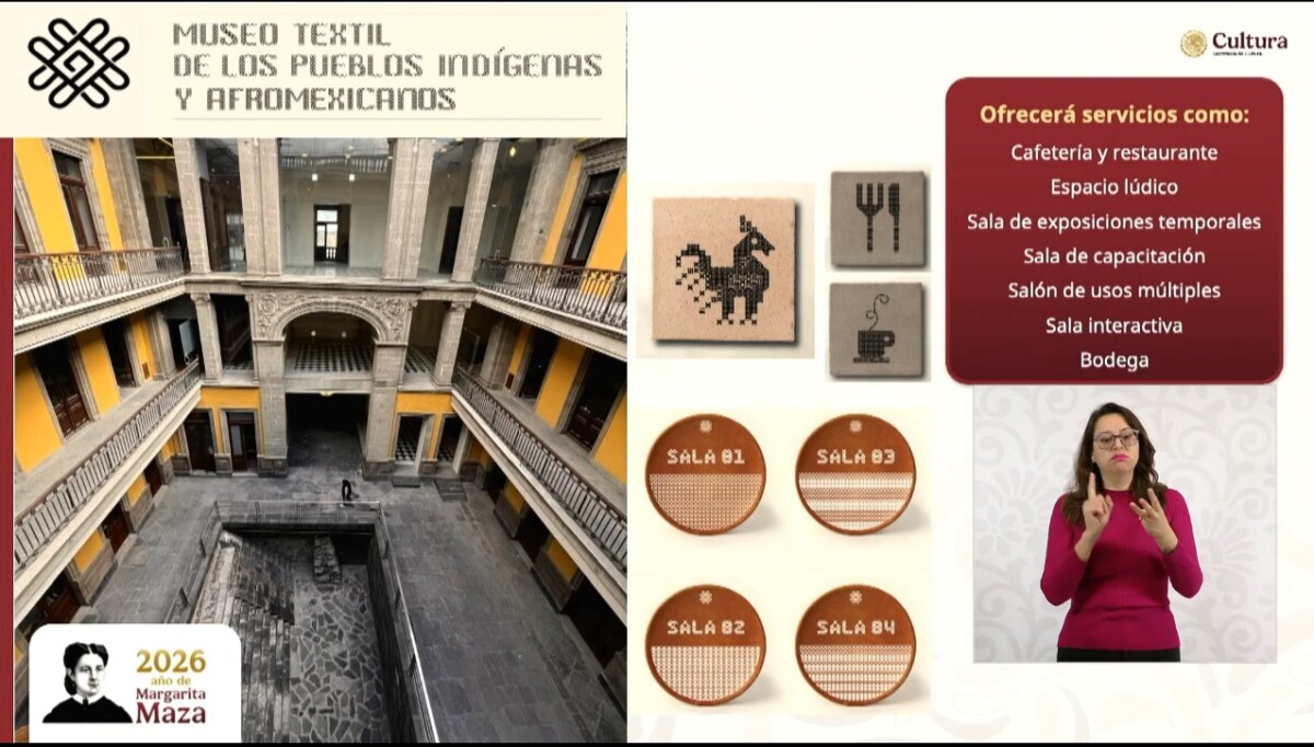 Finalmente, Marina Núñez Bespalova, subsecretaria de Desarrollo Cultural, informó que el nuevo Museo Textil de los Pueblos Indígenas y Afromexicanos se instalará en la Casa del Marqués del Apartado, diseñada por Manuel Tolsá a finales del siglo XVIII, en el Centro Histórico de la Ciudad de México, frente al Templo Mayor.