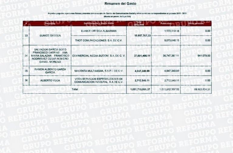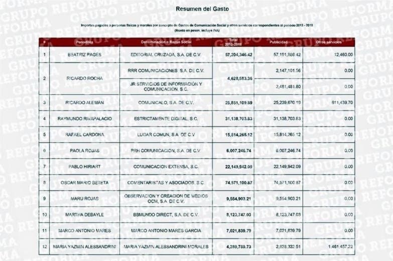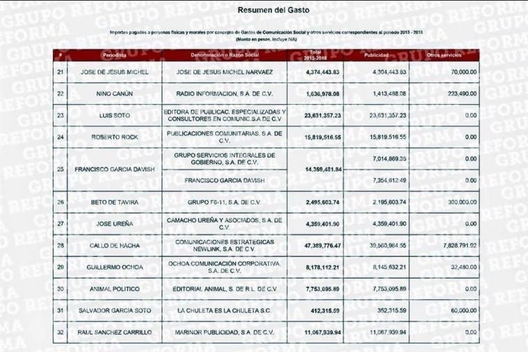El periódico Reforma difundió anoche una lista con los nombres de los 36 periodistas y sus empresas que “fueron beneficiadas con contratos durante el sexenio del ex Jefe del Ejecutivo Enrique Peña Nieto”.