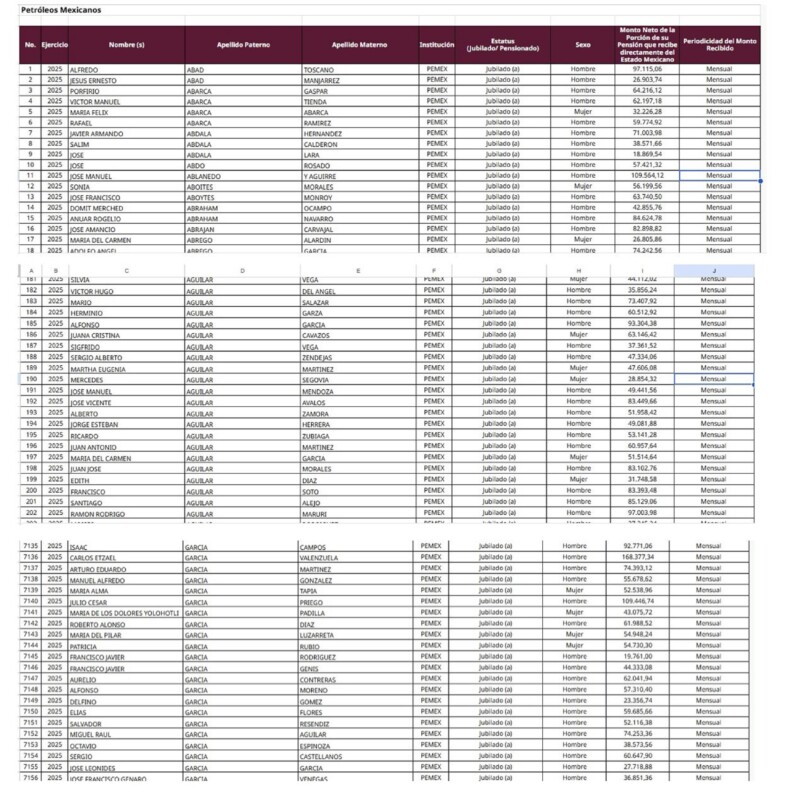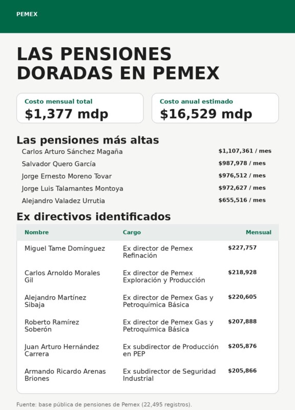 Los datos provienen de la base pública de pensiones de la empresa productiva del Estado, que por primera vez permite conocer con detalle cuánto cuestan las jubilaciones del sistema laboral de Pemex.