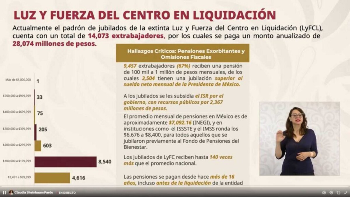 - La extinta empresa Luz y Fuerza del Centro, liquidada por el entonces presidente Felipe Calderón en octubre de 2009, paga 1,788 millones de pesos mensuales en 13,490 pensiones.
