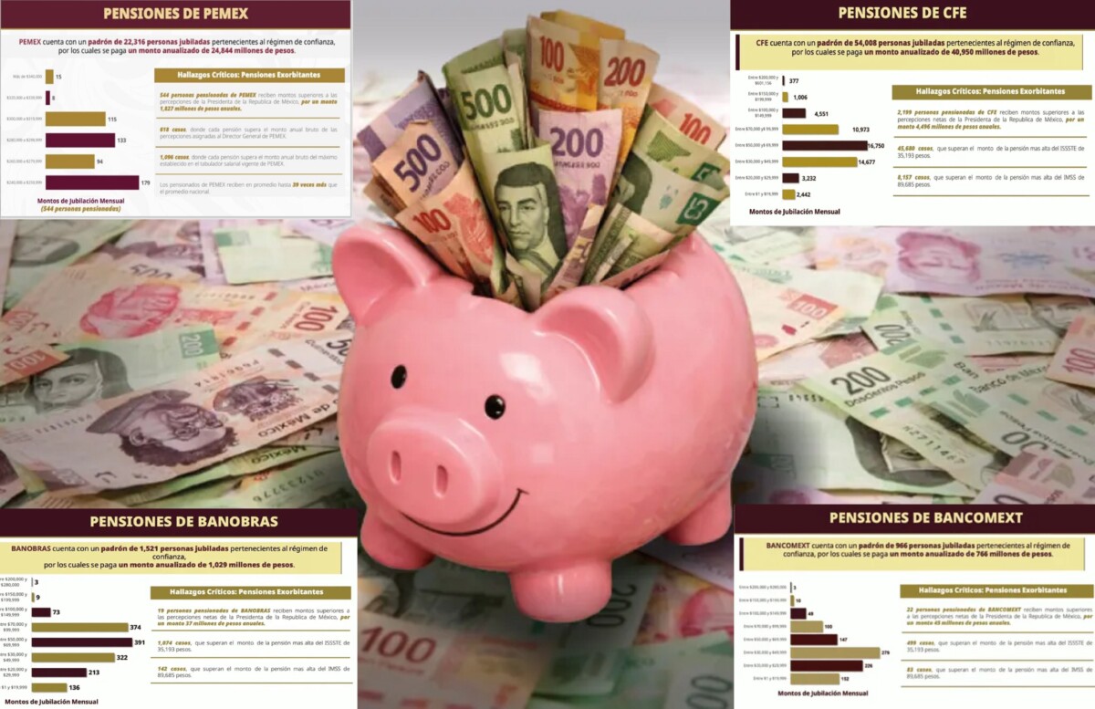 Conforme a la Ley General de Transparencia, las dependencias y entidades deben poner a disposición de la sociedad el listado de personas jubiladas y pensionadas, así como el monto que reciben. Durante un análisis de pensiones en instituciones públicas se detectaron casos que superaban el sueldo presidencial e incluso pagos de más de un millón de pesos mensuales.
