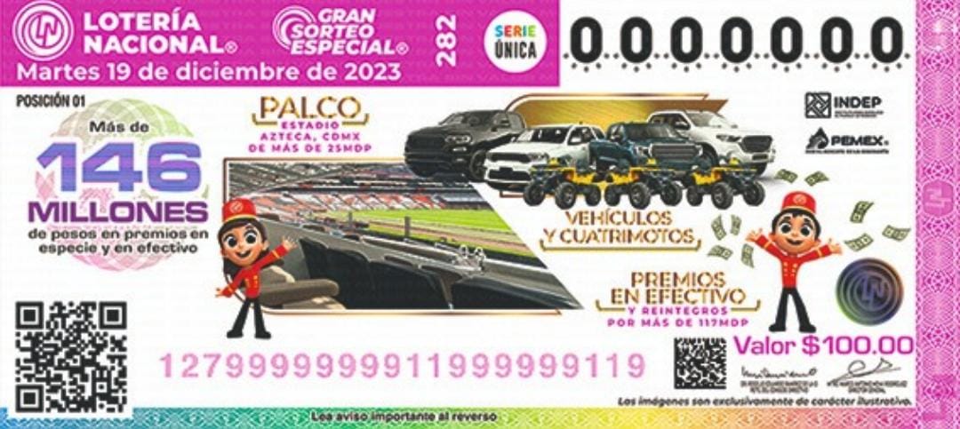 Los premios, que serán en especie y en efectivo, forman parte de bienes confiscados del Instituto para Devolver al Pueblo lo Robado, con un costo de solamente 100 pesos el «cachito», es decir, un boleto, para lo cual la Lotería Nacional ya puso a la venta los boletos en sus mas de 11 mil puntos de venta en todo el país y en alegrialoteria.com.