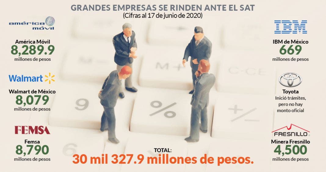 Cinco grandes empresas, algunas integrantes de los mayores corporativos del país, pagaron en los primeros seis meses de este año deudas al Servicio de Administración Tributaria (SAT) por un total de 30 mil 327.9 millones de pesos, luego de que, desde el 12 de diciembre de 2019, el Presidente Andrés Manuel López Obrador aplaudiera la modificación en el Senado de la República al Artículo 28 de la Constitución para evitar la condonación de impuestos porque “esa era la gran fuga”, y emprendiera también una campaña contra los grandes deudores fiscales en México.