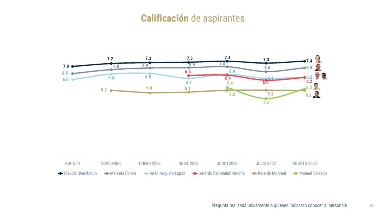 La lista de mejor evaluados dentro de Morena se completa con Ebrard que obtiene 6.9 de calificación y Adán Augusto y Gerardo Fernández Noroña que alcanzan el 6.2.