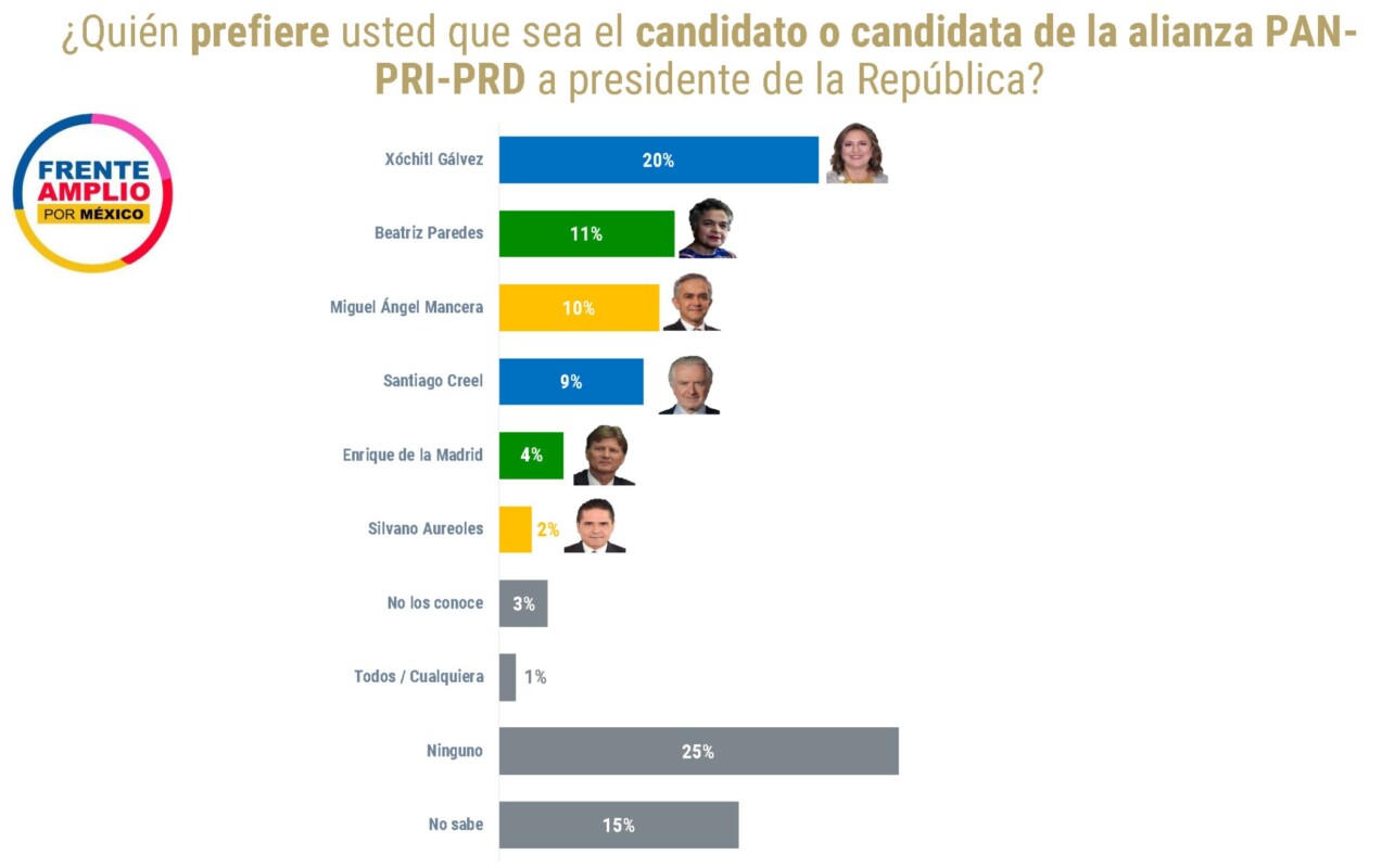 De acuerdo con los resultados de los 6 mil estudios de opinión aplicados en viviendas y por teléfono en la primera encuesta del Frente Amplio, Xóchitl Gálvez obtuvo el 38.3 por ciento de las preferencias, mientras que Beatriz Paredes un 26 por ciento, y Santiago Creel, un 20.1 por ciento.