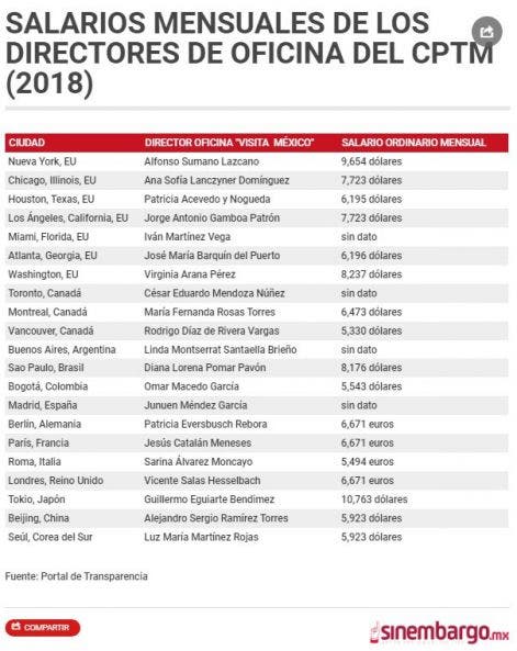 Por las 21 oficinas que el CPTM tenía repartidas en ciudades de Estados Unidos, Canadá, Sudamérica, Europa y Asia, se erogaban 63 millones de dólares, de acuerdo con la Diputada Abelina López Rodríguez, quien encabezó en el Congreso su sustitución por el Consejo de Diplomacia Turística, instalado por la Secretaría de Turismo y Relaciones Exteriores en julio de este año para la promoción e imagen del país a nivel internacional mediante las 80 embajadas y 67 consulados.