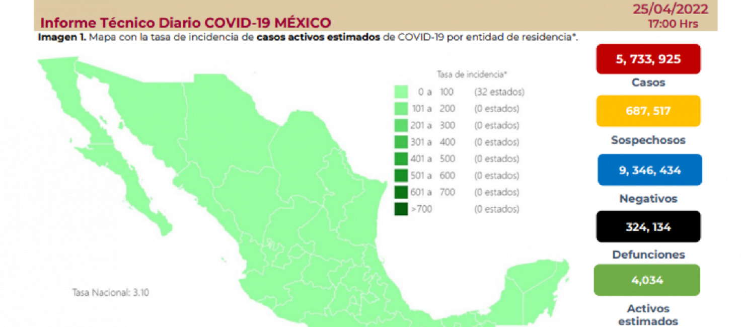 Además, la dependencia confirmó que a partir de hoy 1 de mayo se dejará de emitir la actualización del Semáforo de Riesgo Epidémico, el cual lleva cuatro sesiones consecutivas en color verde.